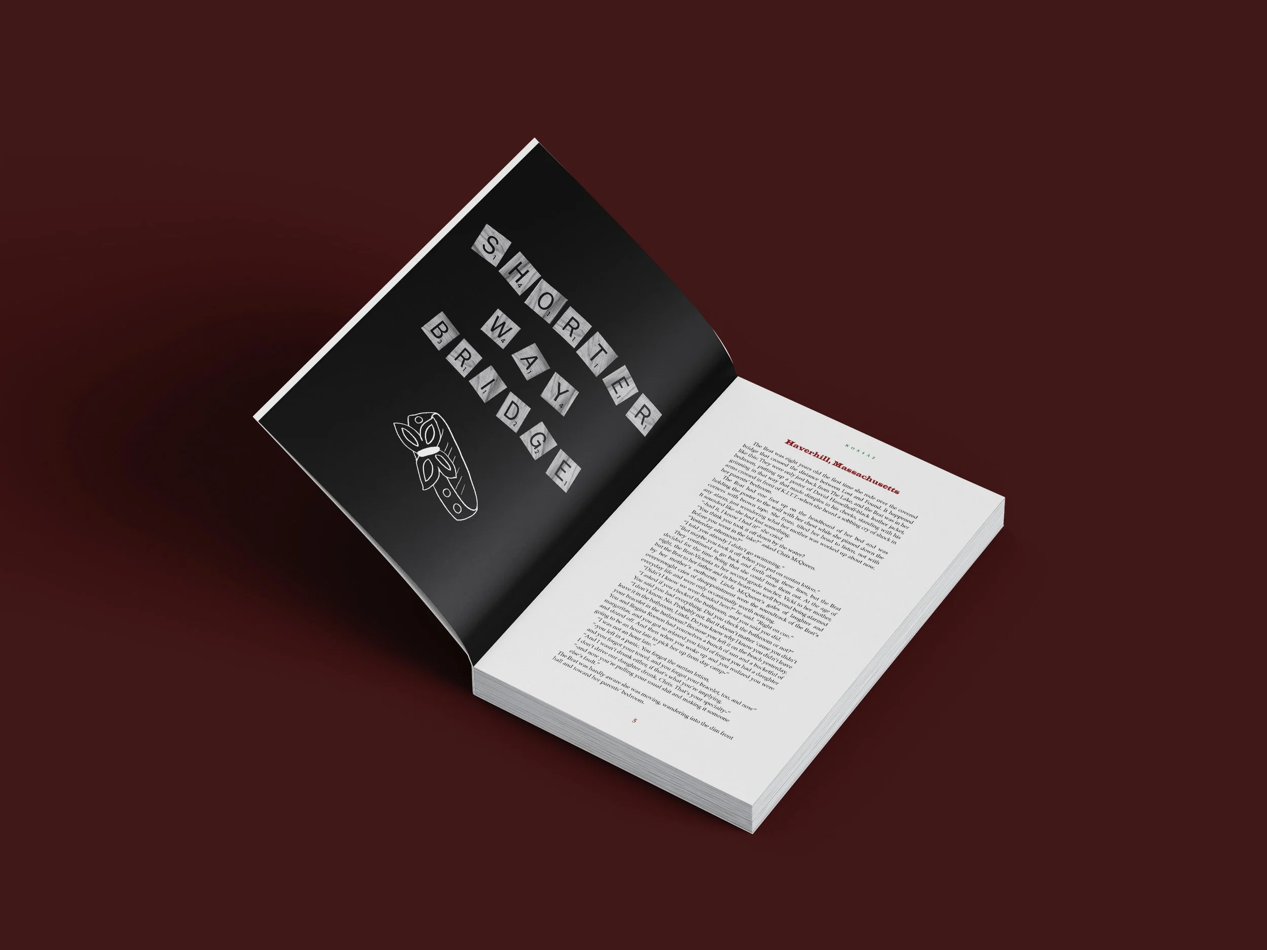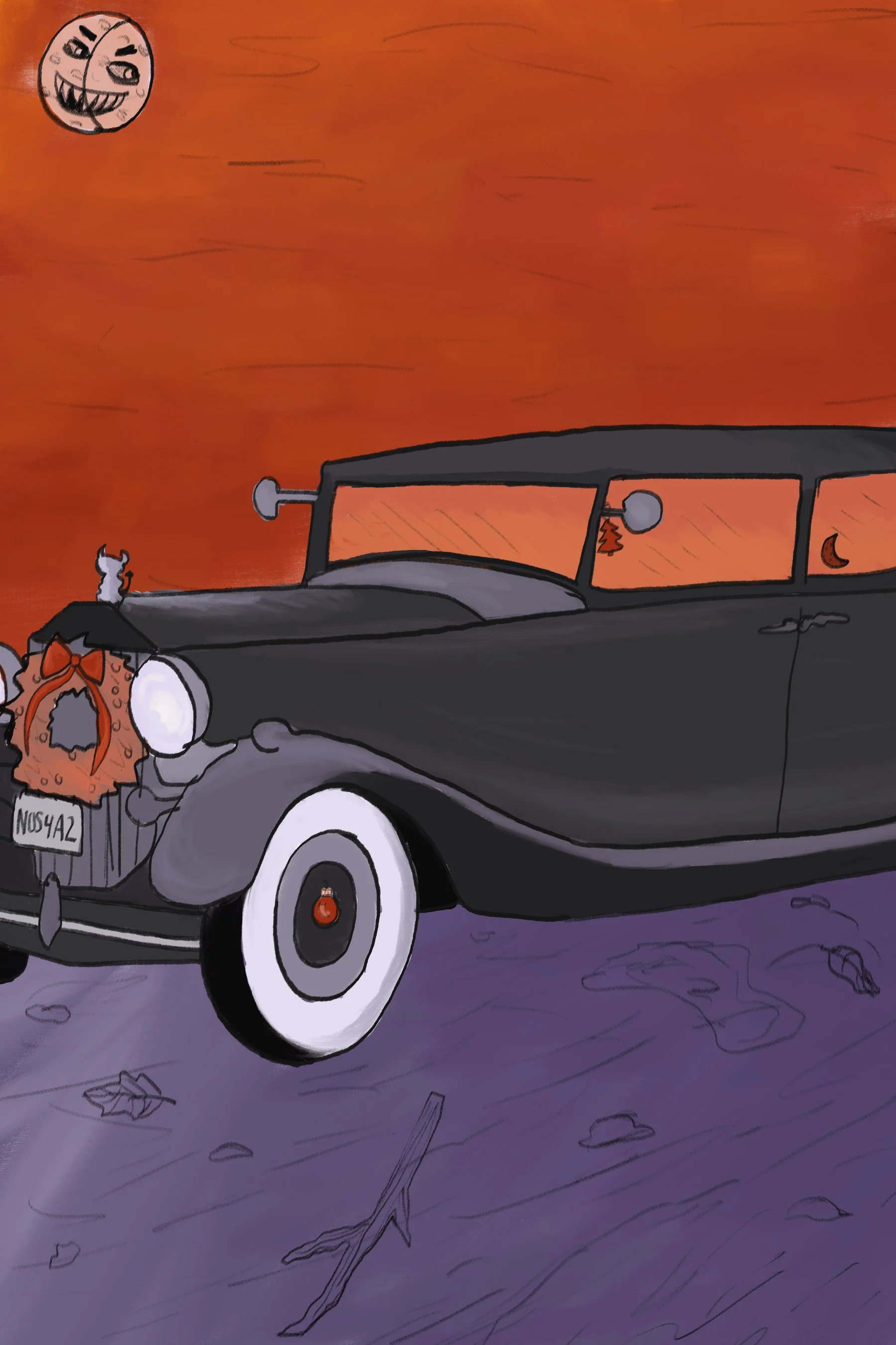 I redesigned the horror novel NOS4A2, which takes its title from the vampiric character “Nosferatu.” The story revolves around a vampire-like villain, Charlie Manx, who kidnaps children in his 1938 Rolls-Royce. The novel combines horror and Christmas elements in its story and visuals. I used a color scheme of red, green, black, and white to match the festive and frightening mood. The image above shows one of the double-page illustrations.